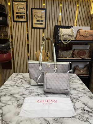 Guess Signature Shopper Tote Set With Matching Wristlet Pouch (White)