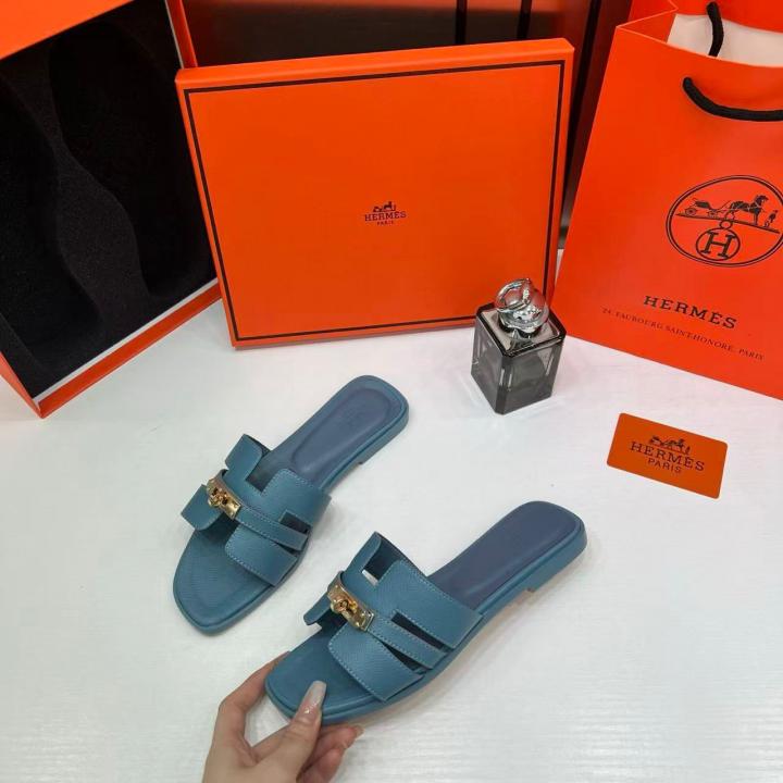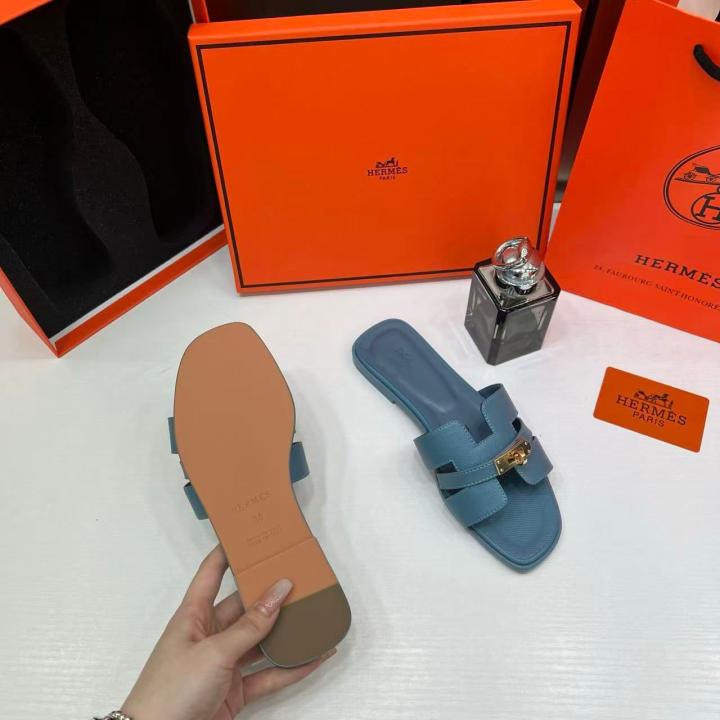 Hermes Paris Oran Flats For Her With OG Box & Carry Bag H38-41 Blue Jean Slide