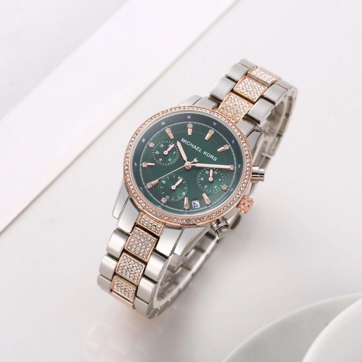 Michael_Kors Bradshaw Diamond Rosegold Green Dial Two Tone
